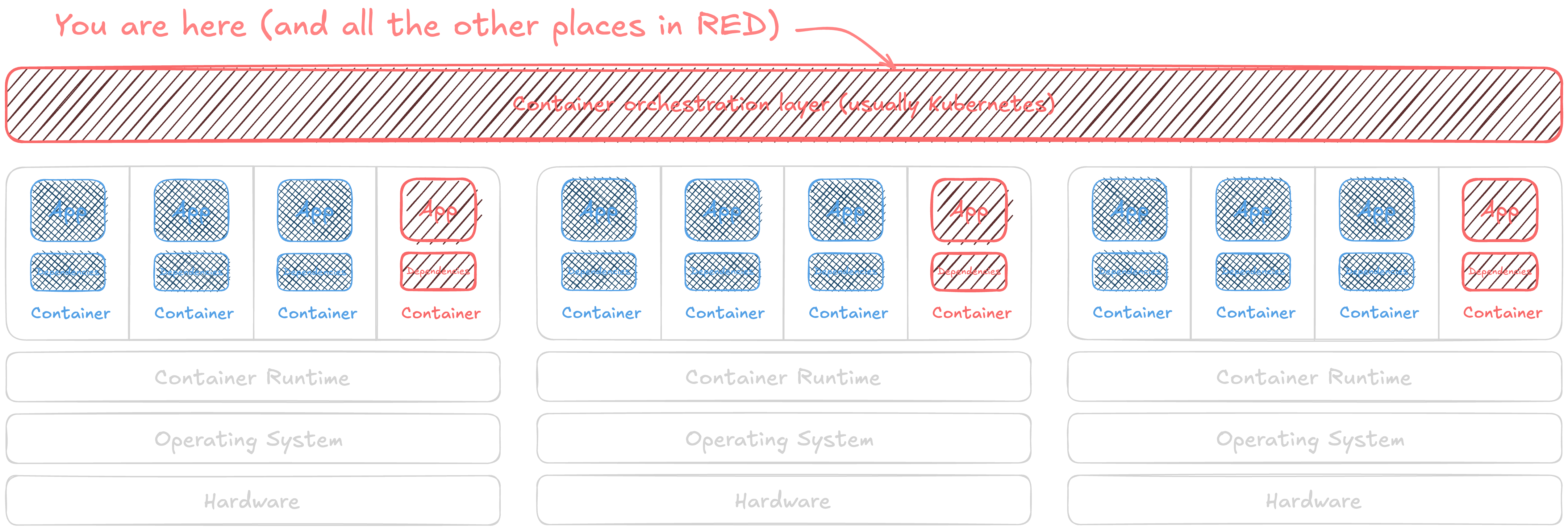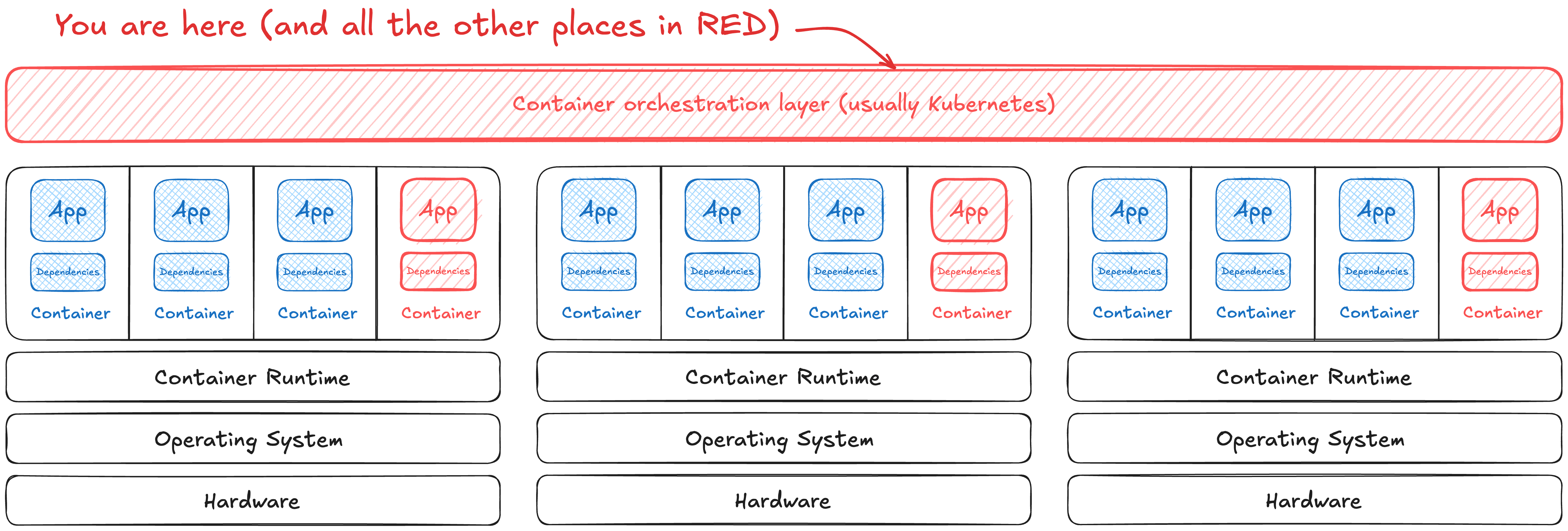 The default these days is Kubernetes (open source) and vendored, opinionated versions like Red Hat OpenShift or SUSE Rancher. There are other orchestrators to know, though, such as Apache Mesos or Hashicorp Nomad … hell, even Docker Compose could technically count as an orchestrator. They all work somewhat similarly, where there’s a service on each node to understand resource utilization and a control plane to schedule work across all the members. We’ll focus on Kubernetes since it’s standard, but these concerns bridge any possible orchestrator.